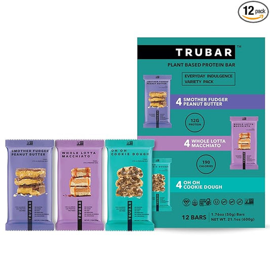 TRUBAR Vegan Protein Bar Variety Pack, Assorted Flavors, Peanut Butter, Macchiato, Cookie Dough, Gluten Free, Vegan Protein Snacks, 12G Plant-Based Protein, High Fiber, Healthy Protein Bars, 12 CT