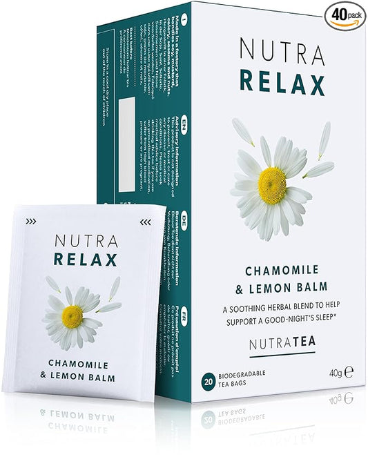 Nutra Tea NUTRARELAX - Sleep Tea | Stress Relief Tea | Calming Teas – For Relieving Stress & A Good Night’s Sleep – Includes Chamomile, Lemon Balm and Passionflower - 40 Individually Wrapped Bags - Herbal Teas (2 Pack)