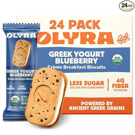 Olyra Greek Yogurt Blueberry Sandwich Breakfast Biscuits, Healthy Snacks for Adults and Kids, Low Sugar, High Fiber, Organic Cookies, USDA Certified Organic, Non GMO, 24 Packs