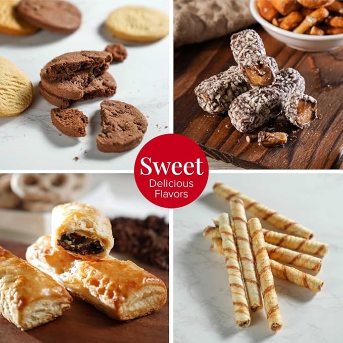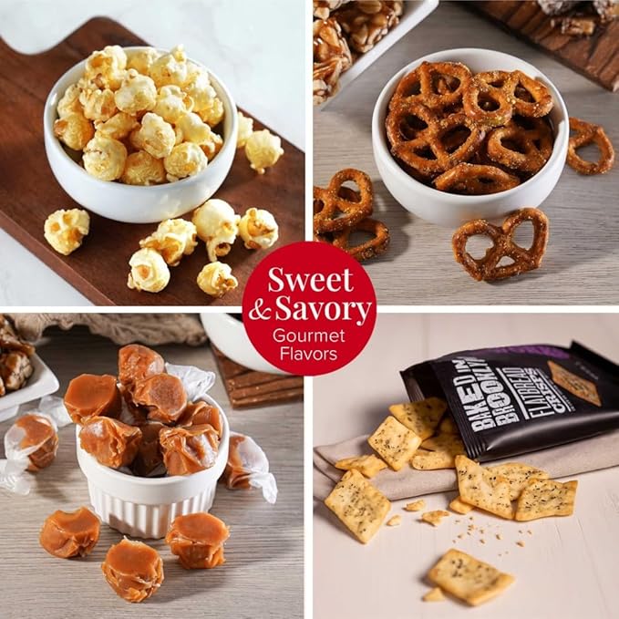 - Gift basket includes: 3 Cheese Sourdough Flat Bread Crisps (3.5oz), Old Dominion Sea Salt Chocolate Dipped Brittle (4oz), Gourmet Caramel Popcorn (3oz), Assorted Fruit Flashers (12pc), Hazelnut Filled Chocolate Wafer Rolls (3.25oz), Milk Chocolate Ghirardelli Square (1pc), Butter Toffee Peanuts (3oz), Lindt Truffles (2pc), Yogurt Peanuts (4oz) & Spicy Cajun Mix (6.5oz)