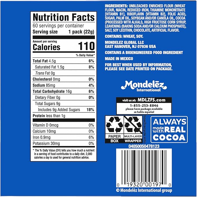 - One box of 60 snack packs, 2 cookies per pack, of OREO Chocolate Sandwich Cookies (packaging may vary)