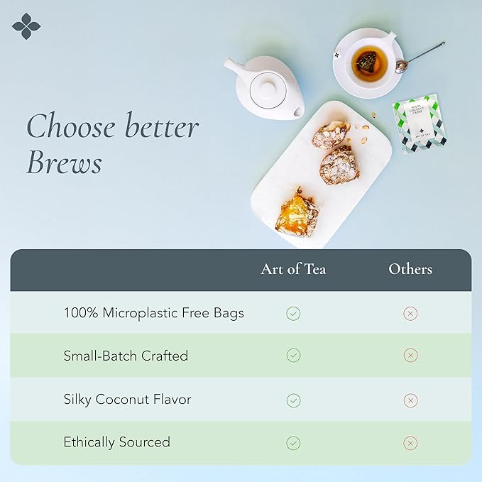- DELICIOUS EXPERIENCE – Find your new favorite with this tea sampler pack from Art of Tea! Includes a set of 12 Organic White Coconut Crème Tea sachets . A dreamy, tropical coconut white tea. White Coconut Crème tea features a gourmet light body flavored, smooth creamy vanilla texture with hints of toasted almond. A sugar free customer favorite both hot and iced with your favorite cream.