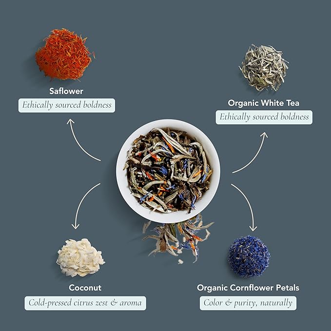 - ADDITIVE FREE - All of Art of Tea’s blends are 100% organic or made of natural ingredients with no additives. This Organic White Coconut Crème Tea includes: Organic White Tea, Organic Safflower, Cornflowers, Organic Coconut, Natural and Artificial Flavors *Contains tree nuts (Coconut)