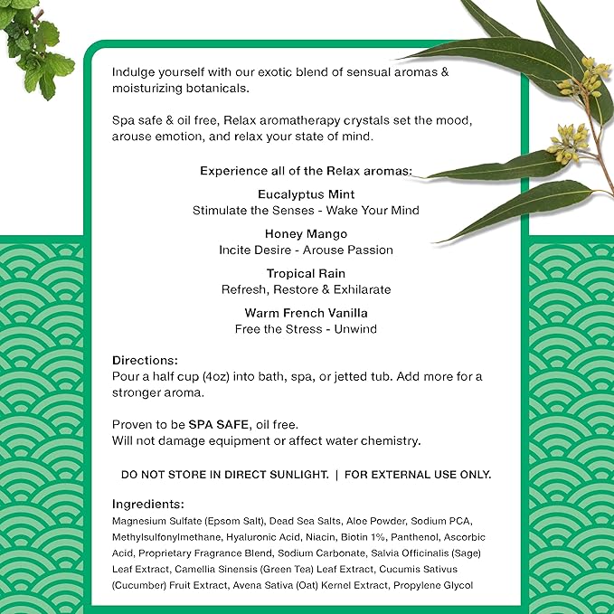- CRISP EUCALYPTUS MINT SCENT: Cool and invigorating, this fresh eucalyptus mint blend brings a spa-like clarity to every soak. Designed for use in hot tubs and Jacuzzis, these aromatherapy bath salts elevate the mood without overpowering the space.