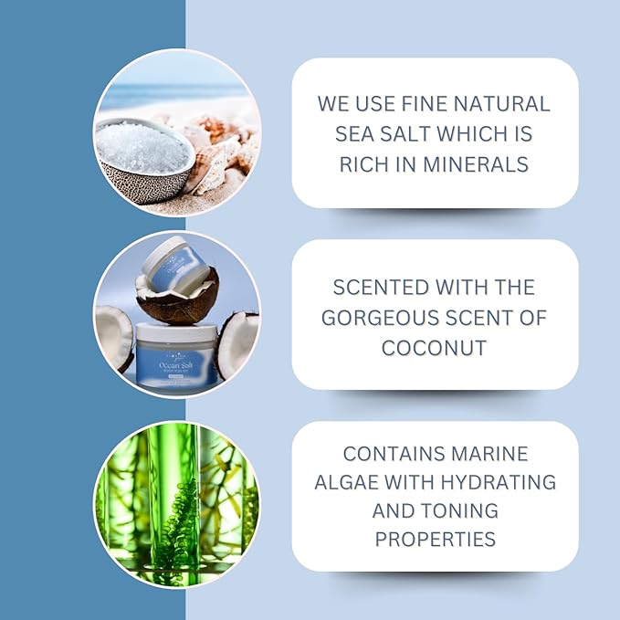 - NATURAL SEA SALT & MARINE ALGAE: Enriched with natural sea salt and marine algae oil, our unique formulation goes beyond exfoliation. The sea salt and marine algae contribute to improved hydration and overall skin condition. Users have reported anti-aging benefits, including a reduction in wrinkle depth, a more unified skin tone, and enhanced skin elasticity. Packed with essential nutrients, this salt scrub not only exfoliates but also moisturizes and nourishes your skin.