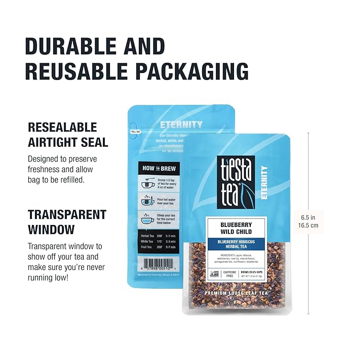 - BLUEBERRY HIBISCUS HERBAL TEA: Refresh your senses with Tiesta Tea’s Blueberry Wild Child blend. This vibrant herbal tea combines sweet blueberries, tangy elderberries, and fragrant hibiscus, offering a caffeine-free, fruity infusion perfect for any season—hot or iced.