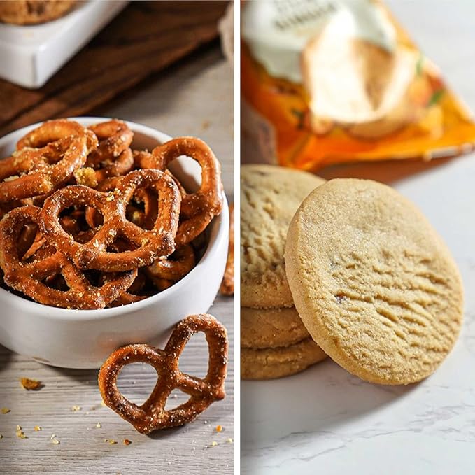 - GREAT GOURMET SNACK VARIETY: Delight loved ones with a Broadway Basketeers gift basket filled with premium snack food gifts and gourmet treats; includes Mint Chocolate Chip Cookies, Peanut Butter Pretzel Nuggets, Daily Crave Himalayan Chips, Walkers Shortbread Cookies, Pirouline Wafer Rolls, and Caramel Popcorn