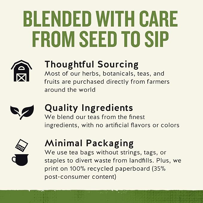- MINIMAL PACKAGING: We use tea bags without strings, tags, or staples to divert waste from landfills. Plus, we print on 100% recycled paperboard (35% post-consumer content)