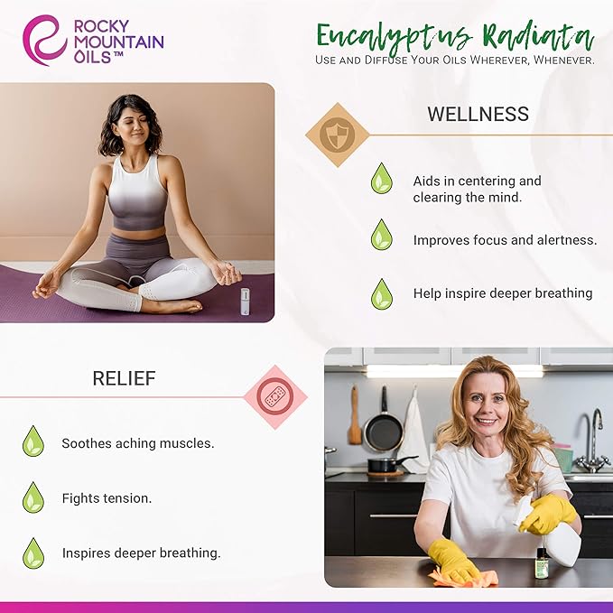 - Eucalypt100% Pure Eucalyptus Radiata essential oil: Eucalyptus Radiata Essential Oil possesses a crisp, woody-like aroma and delivers a wealth of benefits; The incredibly versatile Eucalyptus oil helps calm and center the mind; Ideal for those more who have a more sensitive sense of smell as it has a gentle aromaus oil is also an excellent choice for enhancing massages, providing a calming sensation to the muscles.