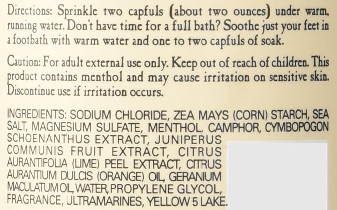 - EASY TO USE: Finding relief for your tired, strained muscles has never been easier! Simply sprinkle two capfuls (about two ounces) under warm running water for a soothing soak. Donβt have time for a full bath? Soothe your tired feet in a footbath with warm water and one to two capfuls of soak.