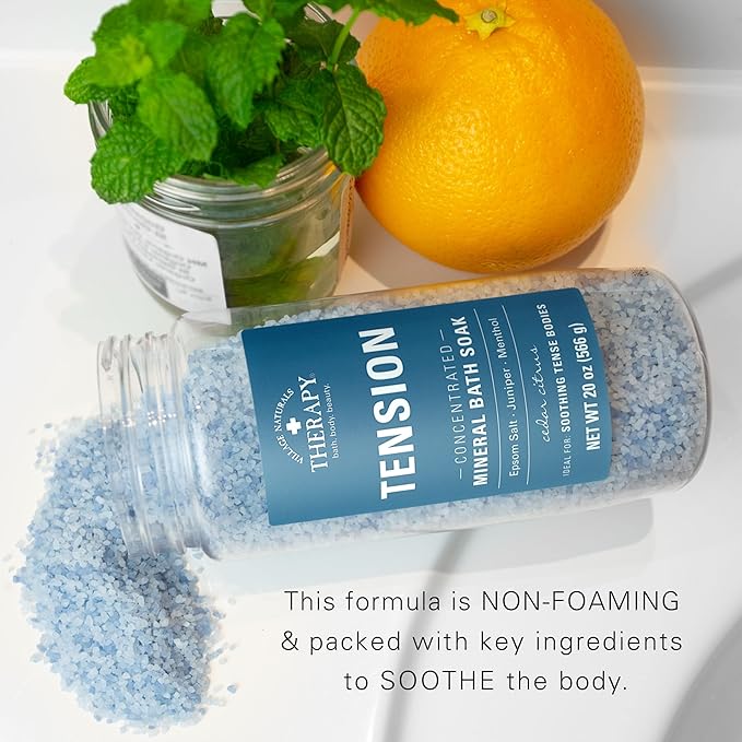- POWERFUL INGREDIENTS: The Aches & Pains Tension Relief Soak is formulated with key ingredients to help ease muscle tension caused by stress and body strain. Let the revitalizing qualities of Juniper, Orange and Menthol relax your tense, overworked muscles. The combination of Sea Salt and Epsom Salt helps to draw out impurities and ease aches and pains.