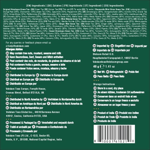 - EXCLUSIVE ASSORTMENT OF GREEN TEAS - Discover the package of nutrition with VAHDAM India's meticulously curated Green Teas Sampler set. This assortment consists of 5 varieties with 4 tea bags each of Himalayan Green Tea, Mint Melody Tea, Ginger Mint Green Tea, Lemon Ginger Tea & Chamomile Mint Tea. Crafted for connoisseurs & newcomers alike, this sampler set is a journey through the subtle art of green tea, allowing you to savor its richness.