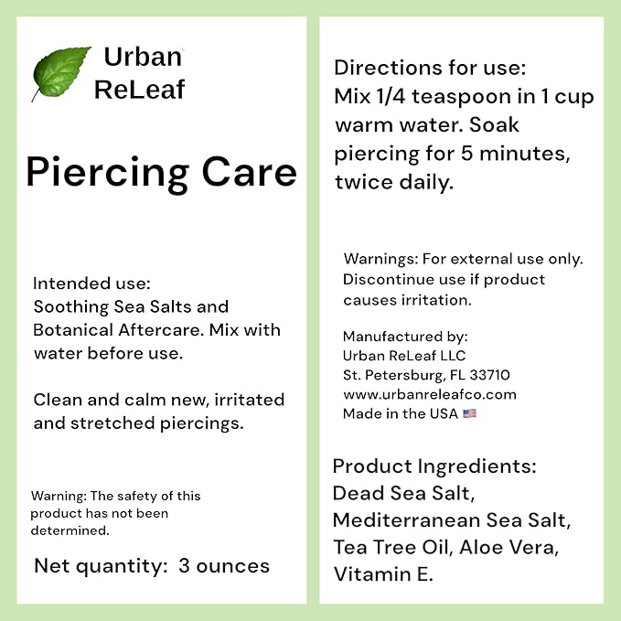 - Urban ReLeaf Piercing Care Intended Use: Soothing Sea Salts & Botanical Aftercare. Mix with water before use. Clean & Calm New, Irritated & Stretched Piercings Warning: The safety of this product has not been determined. Net wt: 3 ounces Directions: Mix 1/4 teaspoon to 1 cup warm water. Soak piercing for 5 minutes, twice daily. Warnings: For external use only. Discontinue use if product causes irritation. Manufactured by: Urban ReLeaf LLC, St. Petersburg, FL 33710. Made in the USA. Product Ingredients: Dead Sea Salt, Mediterranean Sea Salt, Tea Tree Oil, Aloe Vera, Vitamin E