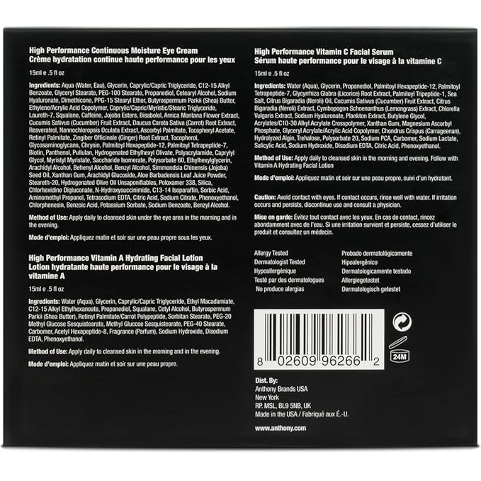 Anthony High-Performance Trio Kit – Eye Cream (0.5 Fl Oz), Vitamin C Facial Serum (0.5 Fl Oz), and Vitamin A Hydrating Facial Lotion (0.5 Fl Oz) – Anti-Aging Skincare for All Skin Types