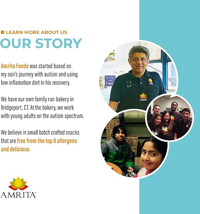 - The Amrita Promise - Enjoy our vegan snacks, crafted in small batches in our allergen-free family-run bakery. We proudly support young adults with autism through our hiring practices and stand by our products.