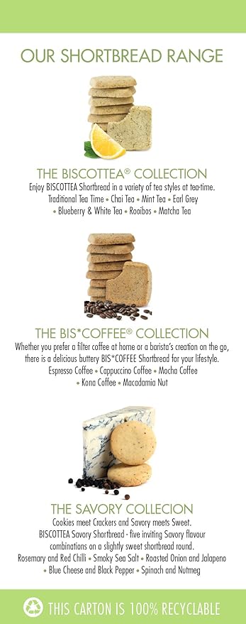- BISCOTTEA Shortbread is baked with All Natural ingredients and combines the richness of a traditional Scottish shortbread recipe with the health attributes of the teas which are baked into each BISCOTTEA square