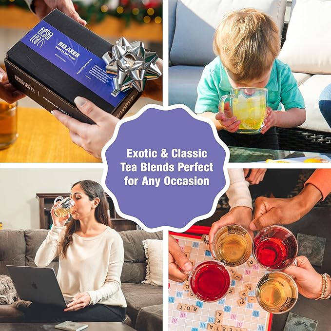 - SAVOR 8 DISTINCT TEA BLENDS: The set features 8 delightful blends, including Cocoa Mint Chill, Ginger Sweet Peach, Lavender Chamomile, Mango Dreamzzz, Nutty Almond Cream, Palm Beach Punch, Cozy Chai, and Chamomile Mint. Each blend provides a distinct taste experience, perfect for exploring new favorites. (Teas may vary for a fresh experience with every set.)