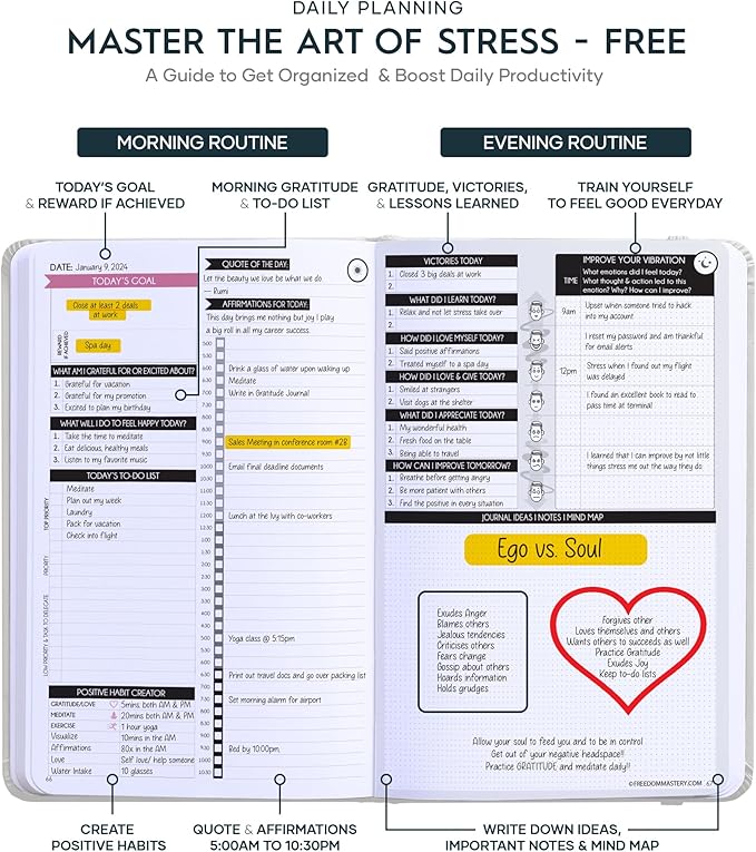 - LUXURIOUS AND TOP QUALITY - Self-care journal for women and men, perfect for entrepreneurs, professionals, college students and everyone who has burning desire to turn dreams into reality! FREE VIDEO MINI-COURSE: You will learn 10-min morning routine used by the most successful people to 10-fold your productivity, focus, happiness & passion! You will master setting goals & fix procrastination!