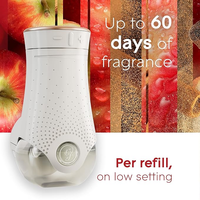 - Each air freshener oil refill offers up to 60 days of continuous diffused apple cinnamon fragrance when used with the new, completely re-designed adjustable fragrance warmer on the low setting