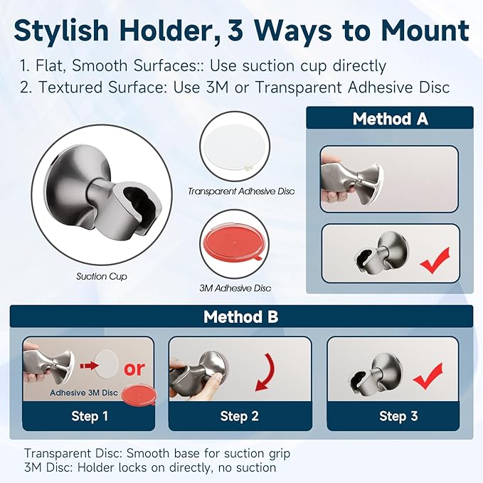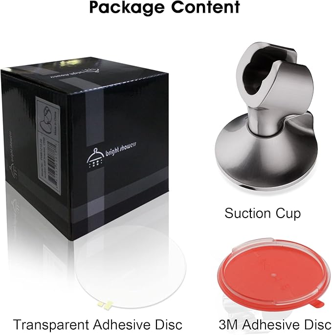 - Easy Installation - Simply attach the suction cup to any clean, flat surface for a secure hold. For textured or rough surfaces, use the large transparent adhesive disc to create a smooth surface for optimal suction. Alternatively, use the included 3M adhesive disc, which provides a locking system to firmly secure the shower holder—no suction required
