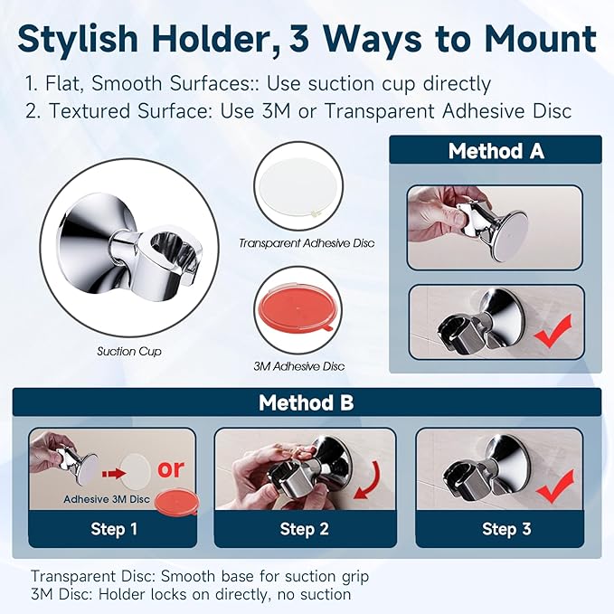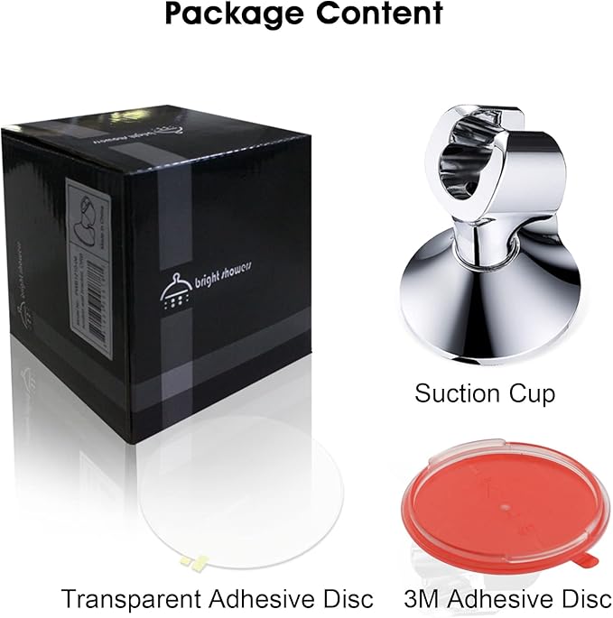 - Easy Installation - Simply attach the suction cup to any clean, flat surface for a secure hold. For textured or rough surfaces, use the large transparent adhesive disc to create a smooth surface for optimal suction. Alternatively, use the included 3M adhesive disc, which provides a locking system to firmly secure the shower holder—no suction required