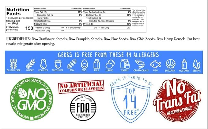- Gerbs Super 5 Seed Mix is a versatile blend of sunflower kernels, pumpkin kernels, brown flaxseed, black chia seed, and ground hemp kernels, offering a powerhouse of nutrition and flavor in every bite. This mix can be enjoyed in a myriad of ways to suit any palate and dietary preference. Sprinkle it over salads or yogurt for a crunchy and nutritious boost, blend it into smoothies for added texture and protein, or incorporate it into baked goods like muffins or energy bars for a wholesome snack option. Whether enjoyed as a topping, a mix-in, or on its own as a convenient snack, Gerbs Super 5 Seed Mix provides a delicious and nutritious addition to any meal or snack time.