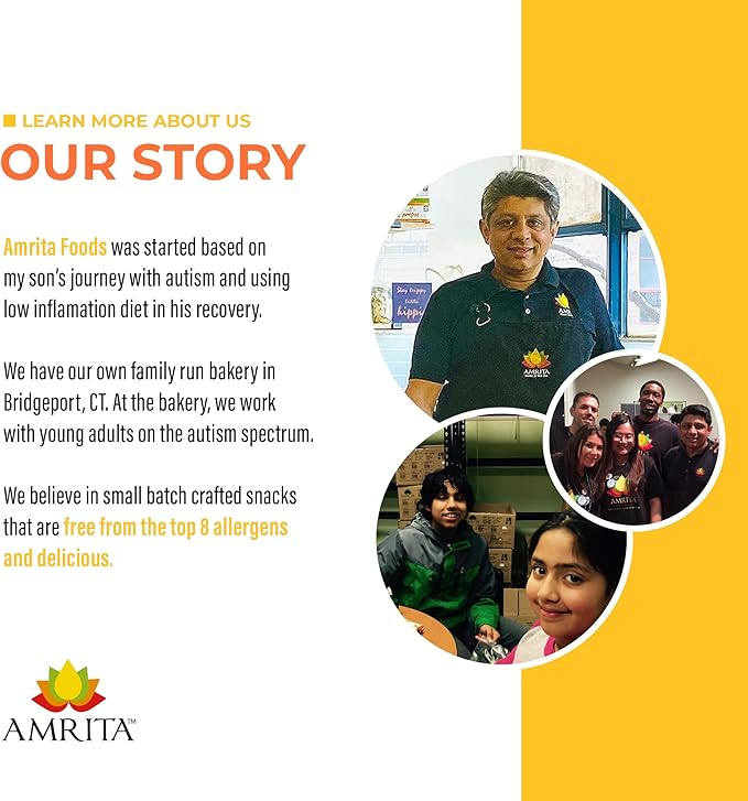 - The Amrita Promise - Enjoy our vegan snacks, crafted in small batches in our allergen-free family-run bakery. We proudly support young adults with autism through our hiring practices and stand by our products.