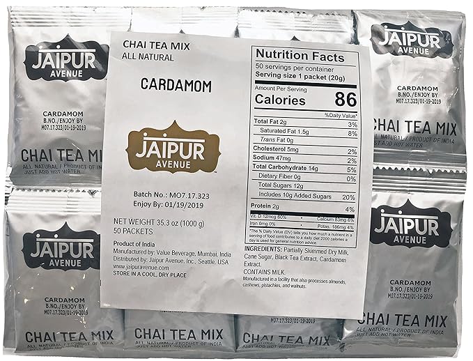 - INSTANT CARDAMOM CHAI, ANYTIME, ANYWHERE: Whip up a delicious cup of cardamom tea in seconds with gluten-free cardamom chai tea mix by Jaipur Avenue. Designed for convenience without compromising on flavors, just add hot water for a heartwarming chai or mix with chilled milk and ice for a refreshing summer treat. Made with Assam black tea, cardamom, premium dry milk, and natural cane sugar, this tea mix by Jaipur Avenue is the ideal cardamom chai latte mix to make chai tea latte in an instant.