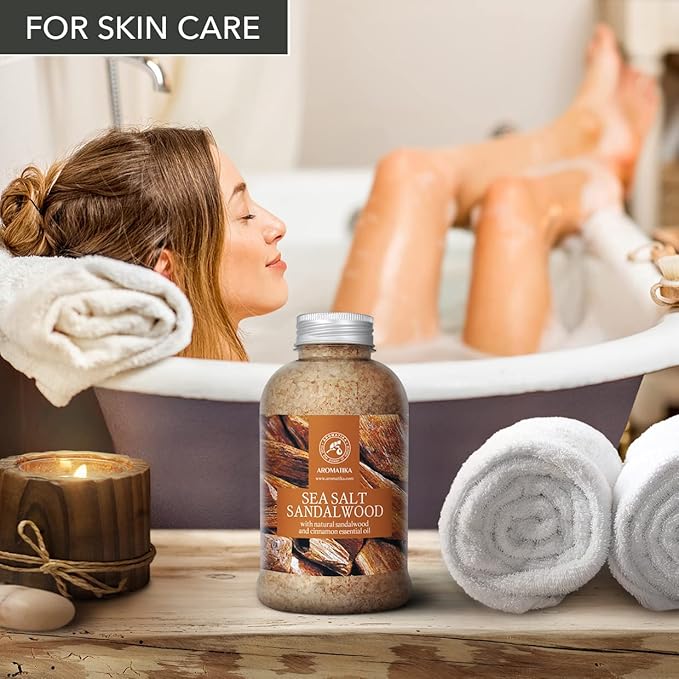Bath Salts Sandalwood 21.16 Oz - Natural Sandalwood & Cinnamon Essential Oil - Sea Salt - Best for Bath - Good Sleep - Relaxing - Body Care - Beauty