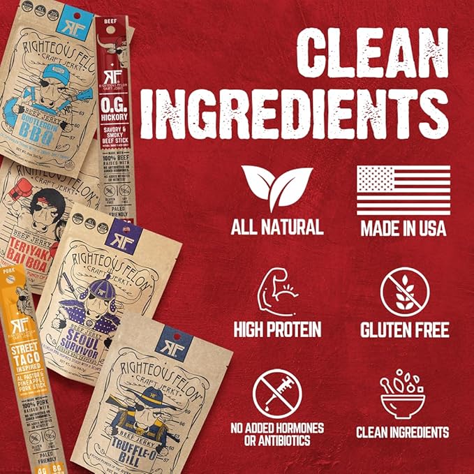 - BEEF JERKY VARIETY PACK: This beef jerky sampler from Righteous Felon assembles our beef jerky & meat sticks. Great everyday low calorie snacks, gifts for men, holiday gifts or stocking stuffers. *GF except Victorious BIG*