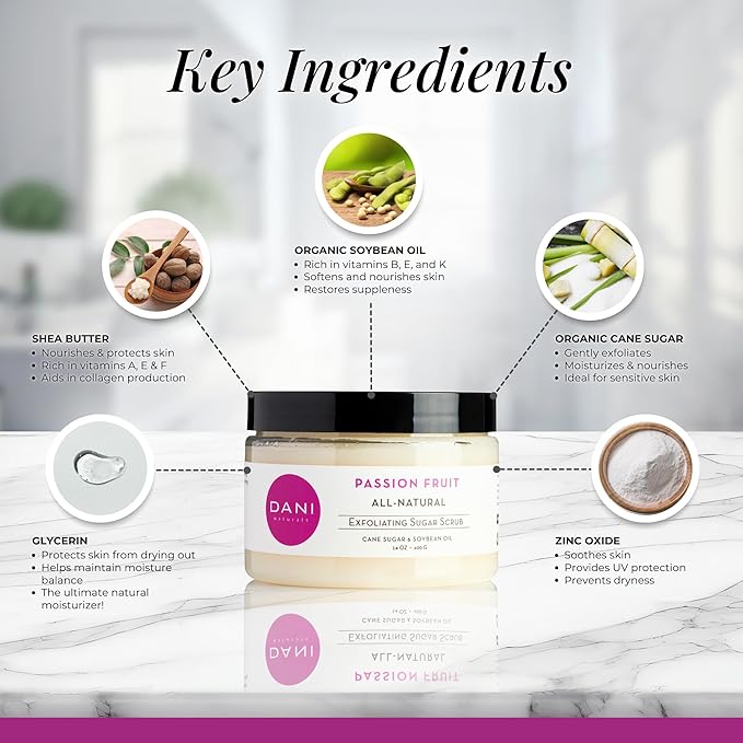 DANI Naturals Sugar Scrub – Pure & Gentle Exfoliation with Juicy Passion Fruit Scent. Organic sugar, shea butter, and nourishing oils for smooth, soft skin – 14 oz