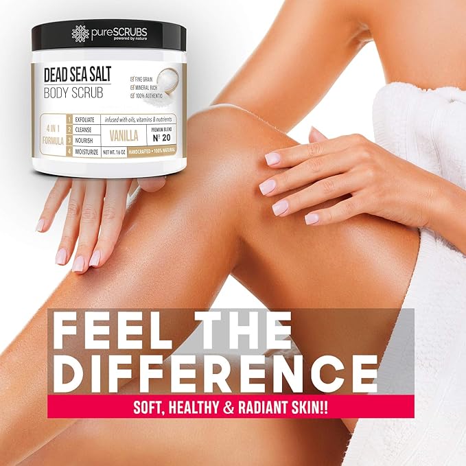 - GET ULTRA SMOOTH SKIN FAST - THIS WORKS! Our unique “4 in 1 Formula” does everything a body scrub should do and more - EXFOLIATE, CLEANSE, NOURISH & MOISTURIZE. Fine grain dead sea salt infused with essential oils, nutrients and skin softeners helps to smooth away rough, bumpy, and uneven textures to instantly reveal your true soft, healthy and radiant skin. You'll love the vanilla aroma!
