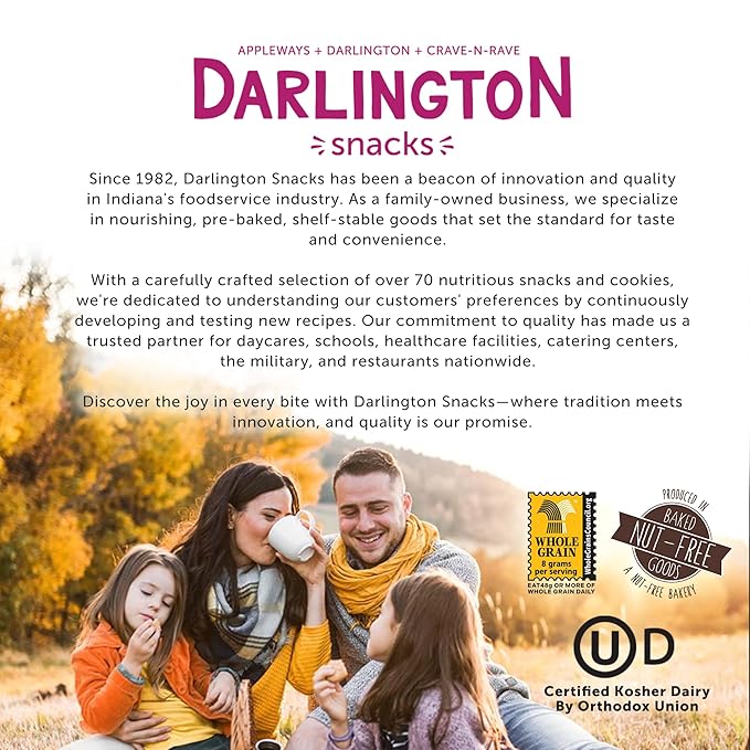 - 70 DIFFERENT SNACK & COOKIE OPTIONS JUST FOR YOU. Darlington Snacks is an established family-owned company in the food industry from Indiana, USA. Our baking team is constantly testing new healthy recipes to appeal to our customers.
