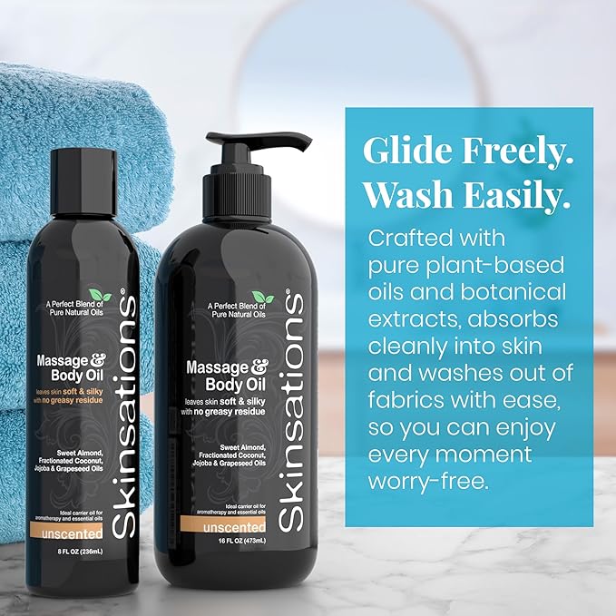 Skinsations - Unscented Massage Oil for Massage Therapy - 8oz | Fragrance-Free Body Oil for Sensitive Skin & Aromatherapy | Sweet Almond, Jojoba, Coconut & Grapeseed Oils