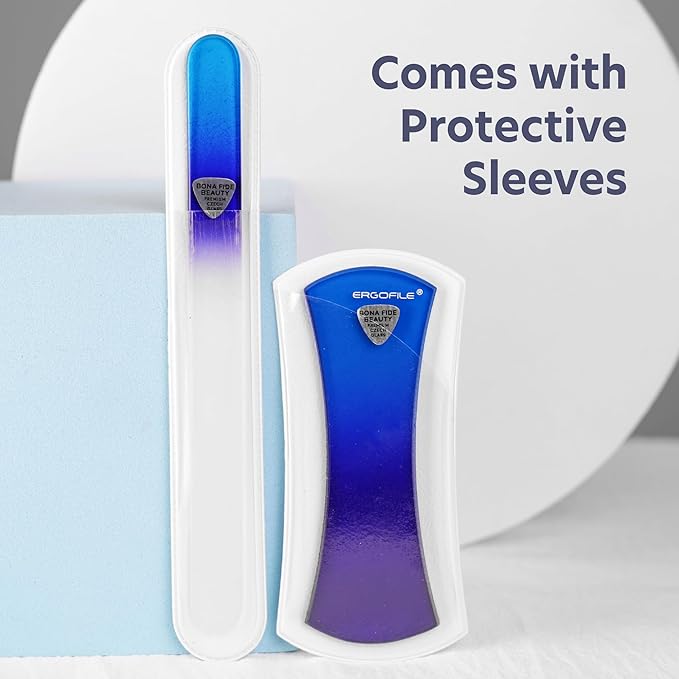 BONA Fide Beauty Glass Nail File Manicure Set, 2-Pieces Blue Ergonomic Comfort Grip Bow Ergofile for Gentle & Efficient Filing, Nail Care Tools Genuine Czech Glass
