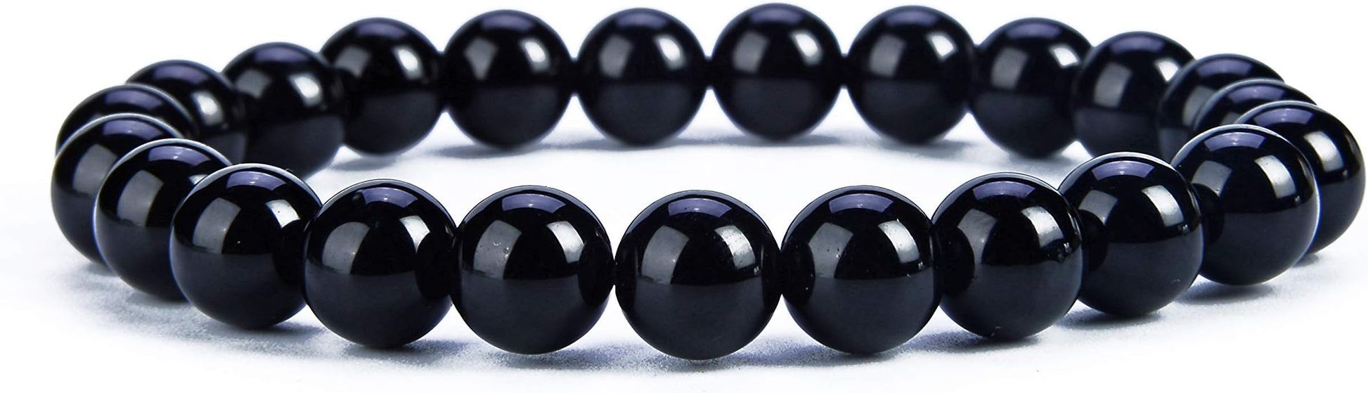- CONTAINS: A black agate bracelet made with 8mm semi-precious beads packaged inside a protective cloth drawstring pouch. Black agate, also sold as black onyx, is a jet-black opaque form of agate or chalcedony. Black agate is a hard stone and takes a very nice polish. Natural agate has lines of white and gray so most of the black agate beads on the market have been dyed a solid black.