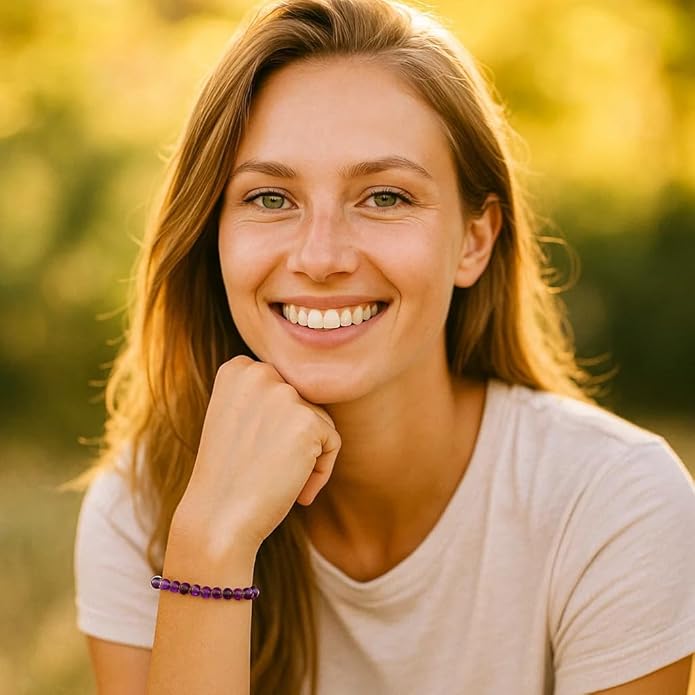 - CONTAINS: An amethyst bracelet made with 6mm semi-precious beads packaged inside a protective cloth drawstring pouch. Amethyst, a violet or purple variety of quartz, is the world’s best known and popular purple gemstone. These stones have been used as gems for over 2000 years. Birthstone of February.
