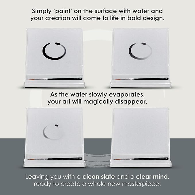 - EVERYTHING YOU NEED IS INCLUDED: This Zen-like water painting board for artists includes a travel-sized 5" x 5" water painting board that will return to its "blank slate" without flaws, bubbles, or peeling. A premium, mini brush with thick, ultra-soft bristles is included with our Zen painting board. Just add water and artistic expression. We also have included a 1 Year of Quality Promise.