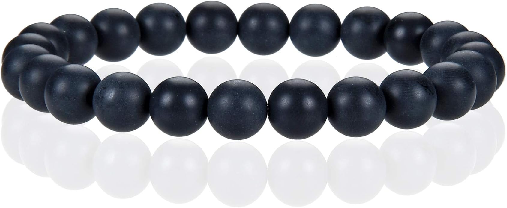 - CONTAINS: A black agate matte bracelet made with 8mm semi-precious beads packaged inside a protective cloth drawstring pouch. Black agate, also sold as black onyx, is a jet-black opaque form of agate or chalcedony. Black agate is a hard stone and takes a very nice polish. Natural agate has lines of white and gray so most of the black agate beads on the market have been dyed a solid black.