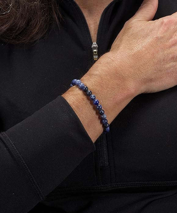 - CONTAINS: A sodalite bracelet made with 6mm semi-precious beads packaged inside a protective cloth drawstring pouch. Sodalite is a rich royal blue colored tectosilicate mineral, with white, grey, and sometimes orange areas.