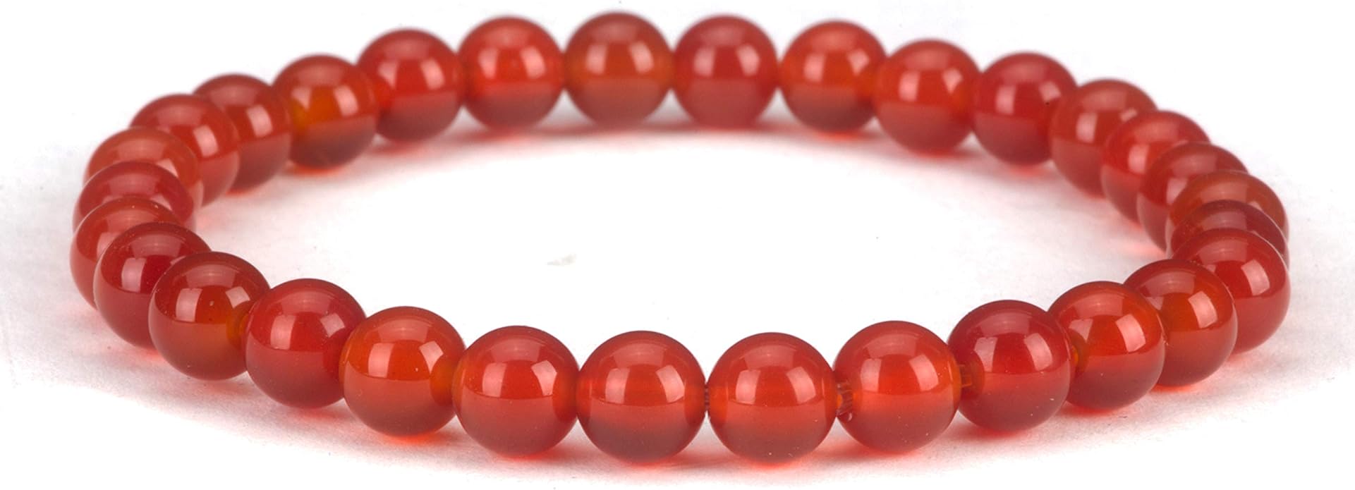 • CONTAINS: A red agate bracelet made with 6mm semi-precious beads packaged inside a protective cloth drawstring pouch. Red agate is a deep orange-red variety of carnelian or chalcedony, a member of the quartz family. Red agate is often dyed, or heat treated to obtain a consistent color.