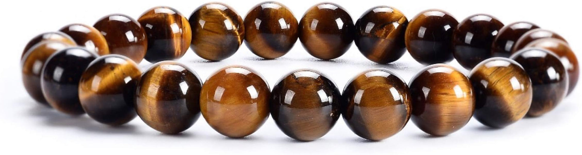 - CONTAINS: A tiger’s eye bracelet made with 8mm semi-precious beads packaged inside a protective cloth drawstring pouch. Tiger’s eye is member if the quartz family. It has chatoyancy, a property which gives it the appearance of having light coming from within the stone. This is the natural brown variety.