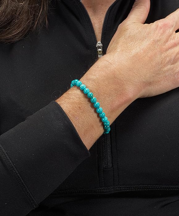 • CONTAINS: A turquoise howlite bracelet made with 6mm semi-precious beads packaged inside a protective cloth drawstring pouch. Turquoise howlite is the trade name for a blue or green dyed form of magnesite. Magnesite is a soft white stone with back or gray matrix lines. It is most-often stabilized to increase hardness and the ability to take a nice polish.