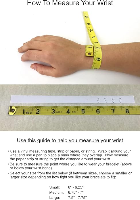 - UNISEX: Three sizes available: Small (6”-6.25”), Medium (6.75”-7”), and Large (7.5”-7.75”). Please measure your wrist at the point you like to wear your bracelets. If between sizes, size up or down depending on if you like your bracelets a little tight or loose. Please see the description below for an easy way to measure your wrist.