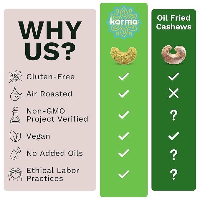 - AIR ROASTED WITHOUT OIL: Skip the oil-fried cashews. Karma Nuts cashews are air roasted as a healthier, tastier alternative while still maintaining that delicious buttery taste.