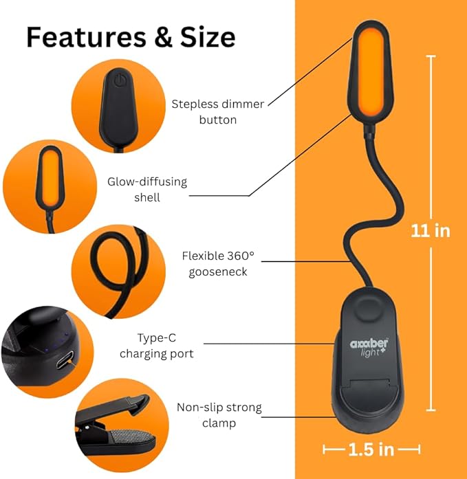 - ✔ EXCELLENT GIFTS OR STOCKING STUFFERS - Amber Light reading lights are the perfect gifts for the bookworms in your life! Create the best bundle they've ever received by pairing it with a book or blanket. Our lights are perfect for children and can be dimmed and used as a soft nightlight for a warmer, cozy atmosphere that can soothe your kids into a deep, comforting sleep as effectively as a lullaby!