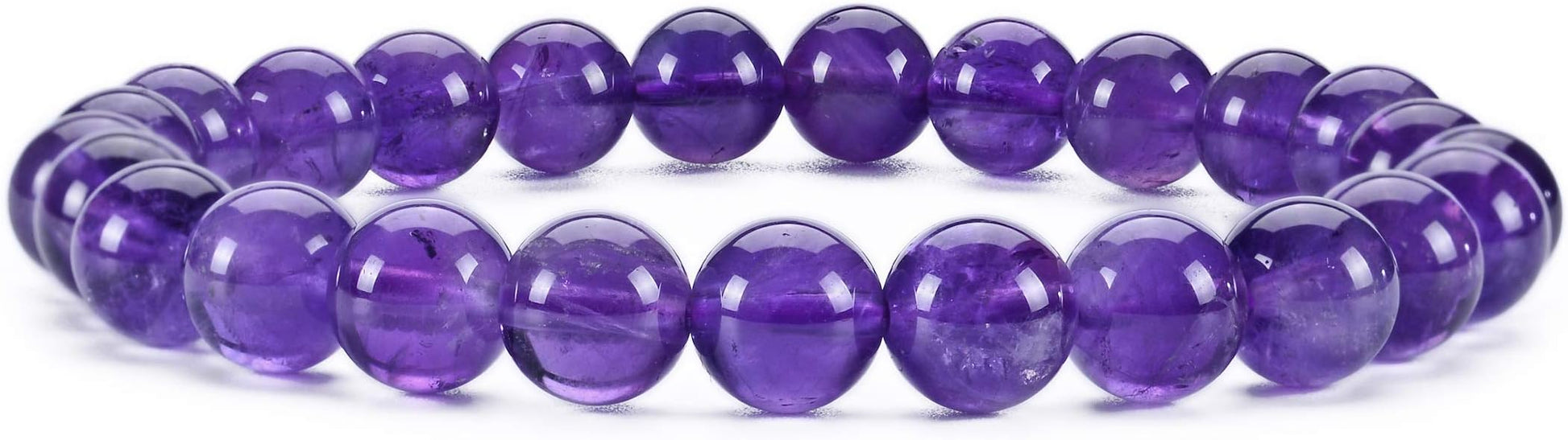 - CONTAINS: An amethyst bracelet made with 8mm semi-precious beads packaged inside a protective cloth drawstring pouch. Amethyst, a violet or purple variety of quartz, is the world’s best known and popular purple gemstone. These stones have been used as gems for over 2000 years. Birthstone of February.