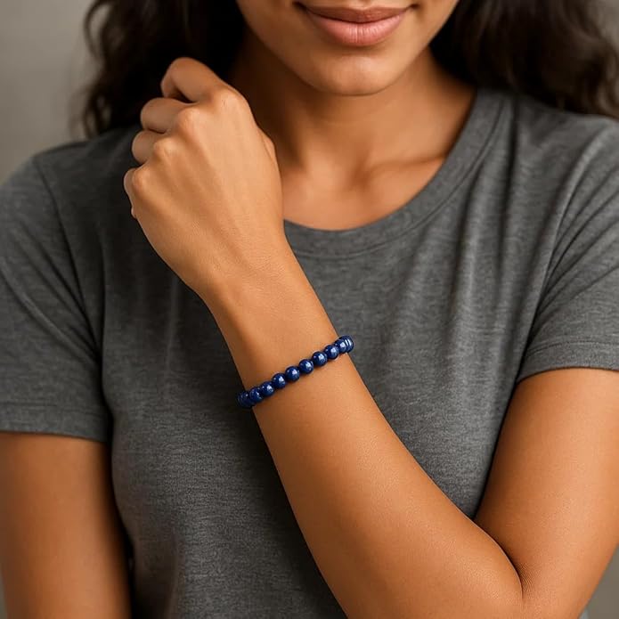 - CONTAINS: A lapis bracelet made with 8mm semi-precious beads packaged inside a protective cloth drawstring pouch. Lapis Lazuli is a metamorphic rock that has been highly sought after due to its rich blue color. Often consisting of lazurite, calcite, and pyrite. Our beads are non-dyed.