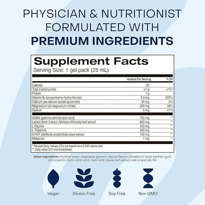 - All-in-One Formula Replaces 10 Pills: The future of vitamins is pill free. This physician and nutritionist formulated gel pack helps promote deep, restful sleep with over 2,384 mg of melatonin, L-theanine, GABA, magnesium, 5-HTP and other essential nutrients to help you relax, fall asleep, stay asleep, and wake up refreshed.