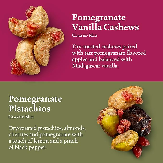 - GLAZED NUT MIX VARIETY PACKS – Our nut variety snack packs include Four of our Glazed Nut Mixes so you can get a taste of each; (3) Maple Pecans, (3) Pomegranate Pistachios, (3) Honey Almonds, and (3) Pomegranate Vanilla Cashews